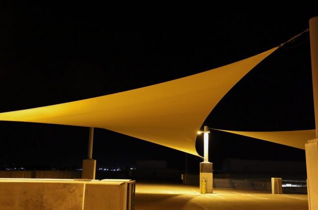 A shade sail is a device to create outdoor shade based on the basic technology as a ship’s sail. Shade sails use a flexible membrane tensioned between several anchor points. While generally installed permanently, they are cheap and easy to set up. They are usually provided above public gathering places such as seating areas and playgrounds in countries where strong sun radiation makes prolonged stays in the open sun unpleasant or dangerous due to sunburn and skin cancer risk.